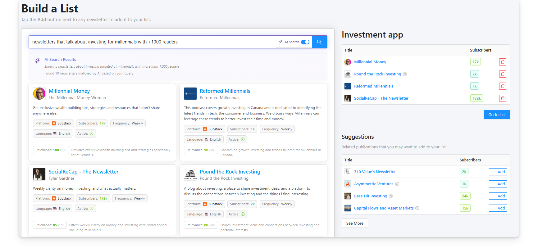 Our app will likely appeal to a young-mid-age audience. So, let’s search for “newsletters that talk about investing for millennials with >1000 readers".
