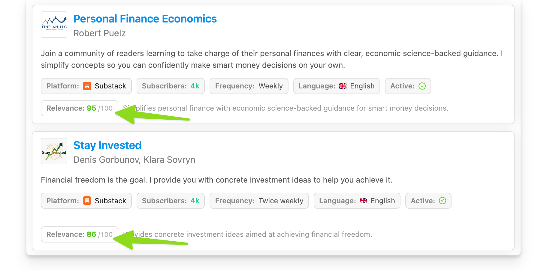 Reletter's AI gives each search result a relevance score, showing exactly how closely a newsletter matches your search term.